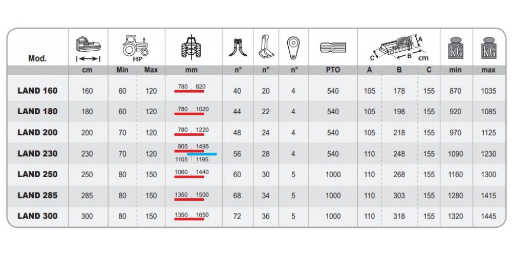 | Mod. | Munkaszélesség | HP min. | HP max. |
