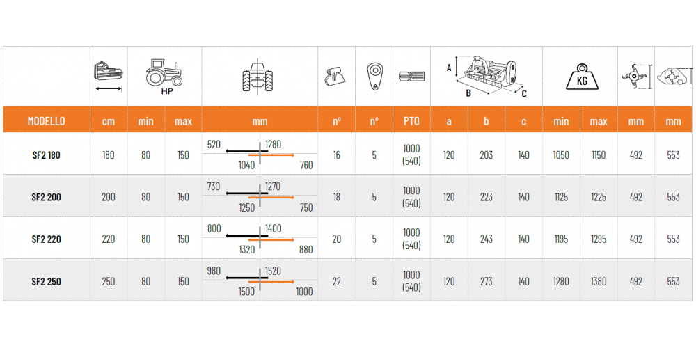 Kifejezetten gyümölcsösök és erdőszegélyek számára tervezve. Alkalmas fű, bozót, metszési hulladék és akár 10–12 cm átmérőjű ágak aprítására. Használható 80–150 LE teljesítményű traktorokkal.